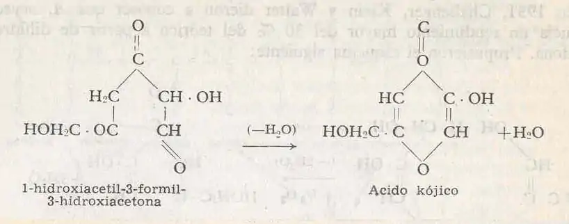 Corbellini y Gregorini (1930) sugirieron que a partir de los compuestos tricarbonados pueden condensarse para formar una molécula que pasa a ácido kójico por deshidratación: