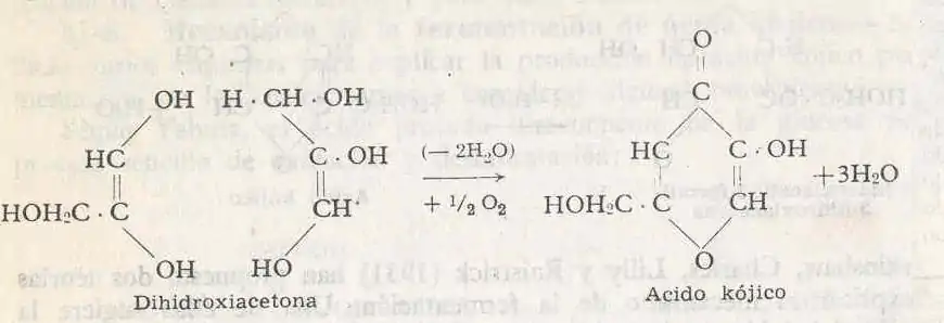 Katagiri y Kitahara (1933), como resultado de una extensa investigación, concluyen que, de todas las sustancias sugeridas, la dihidroxiacetona es la que probablemente desempeña el papel más importante en la formación del ácido kójico.