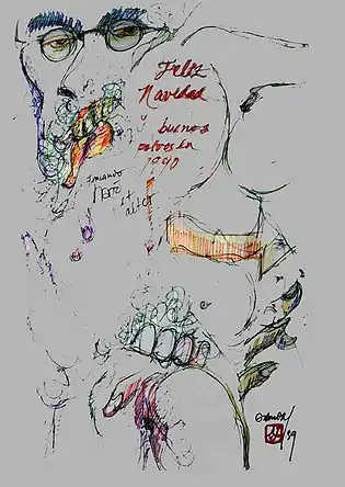 - "Feliz Navidad y buenos polvos". Técnica mixta sobre papel de arroz. 1989. Colección particular. Beijing.
