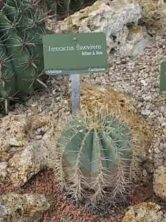 Ferocactus: nombre genérico que deriva del adjetivo latíno "ferus" = "salvaje" , "indómito" y "cactus", para referirse a las fuertes espinas de algunas especies.