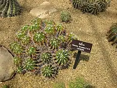 Se trata de una planta que crece con muchos tallos y alcanza una altura de hasta 1 metro y un diámetro de más de 2 metros. Los tallos individuales son esféricos a cilíndricos, de color verde. Tiene 13 afiladas costillas. Las areolas están muy separadas. Las espinas, como agujas, son de color marrón claro a gris. Los cuatro a seis espinas centrales son de hasta 8 cm de largo. Las aproximadamente 12 a 20 espinas radiales se irradian, las superiores son de color más claros. Las flores en forma de embudo, de color amarillo a rojo amarillento aparecen en las areolas jóvenes en la punta de crecimiento. Alcanzan una longitud de hasta 3 centímetros y tienen un diámetro de 2.5 cm. Los frutos de hasta 2,8 cm de largo, son elipsoide y de color rojo.