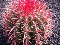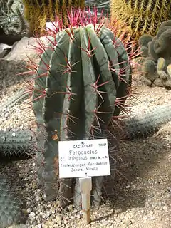 Ferocactus: nombre genérico que deriva del adjetivo latíno "ferus" = "salvaje" , "indómito" y "cactus", para referirse a las fuertes espinas de algunas especies.