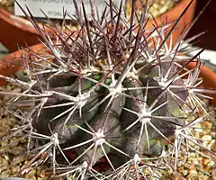 Se trata de una planta globular, que crece individualmente con el tallo esférico a corto cilíndrico, de color verde grisáceo y alcanza los 40 centímetros de diámetro y una altura de hasta 60 centímetros. Tiene 13-18 costillas con espinas grises. La espina central es única, recta, redonda y larga de hasta 4,5 cm. Las cinco a seis espinas radiales son rectas o ligeramente curvadas y tienen una longitud de 2,5 a 3 centímetros. Las flores tienen forma de campana, de color amarillo y crecen hasta una longitud de 5 centímetros y tienen un diámetro de 3 a 4 centímetros. Las frutas de 1.5 cm de largo, con forma de huevo son de color púrpura.