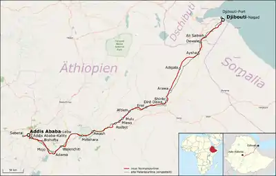 El ferrocarril comienza en Sebeta (2.356 metros sobre el nivel del mar), en las afueras de Adís Abeba. La capital de Etiopía es servida por dos estaciones ubicadas en las afueras de la ciudad, en Furi-Labú y Kaliti. Los pasajeros se pueden transferir desde Kaliti al Tren Ligero de Adís Abeba, que da acceso al centro de la ciudad.