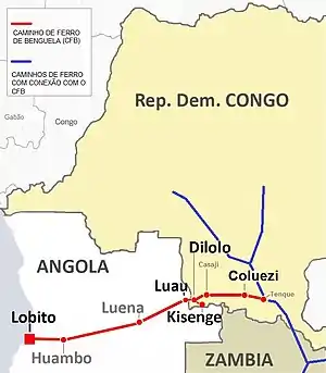 El ferrocarril de Benguela tiene una longitud de 1344 km en Angola y proporciona acceso a la parte interior del país, y alcanzó su mayor logro al enlazar con el Cinturón del Cobre (Copperbelt) de la provincia de Katanga, en la República Democrática del Congo, y Zambia. El ancho de vía es de 1067 mm, como es habitual en la mayoría de ferrocarriles de la región. Los inversores en las minas de cobre invirtieron en el ferrocarril para la exportación del cobre vía Lobito, hecho posible por la conexión en el sur de Katanga desde Tenke en la RD del Congo de la Línea de Katanga a Dilolo y Luau en la frontera.