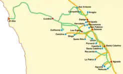 ![]() Trazado del Ferrocarril de Junín (en color verde) hacia 1930. Las oficinas salitreras aparecen marcadas en celeste y las estaciones en rojo, mientras que la línea naranja corresponde al Ferrocarril Salitrero de Tarapacá. | ||