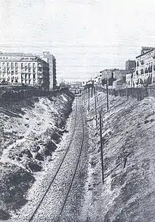 En 1929, el Ayuntamiento elaboró una memoria sobre el estado de la ciudad —con el objetivo de proporcionar la información necesaria para la elaboración de los proyectos participantes en el concurso internacional convocado para la elaboración de un Plan de Extensión de Madrid—. En ella se reflejaba el tremendo impacto que la vía de circunvalación tenía en Madrid. Las conclusiones apuntaban el enorme desarrollo que la industria había tenido en la capital, que además se había concentrado en la parte sur del previsto ensanche —sobre todo las ligadas a la construcción, la metalúrgica y de electricidad y la química—. Esto era fruto, exclusivamente, de la presencia de la vía de contorno y de las estaciones de mercancías situadas sobre ella.[53] Todo ello supuso, al menos inicialmente, un freno a la edificación en la parte sur del plan de ensanche, así como numerosos conflictos con los vecinos de las zonas pobladas próximas a la vía. Así, los vecinos del distrito de la Inclusa plantearon numerosas quejas al Ayuntamiento, el cual conminó a la Compañía del Norte a que hiciera un túnel para que discurriera por él la línea de circunvalación, al menos en la parte más transitada.[54] Finalmente, en 1931, la Compañía del Norte solicitó el permiso necesario para soterrar la línea de circunvalación en el tramo de la calle del Ferrocarril, que le fue otorgado.[55] En 1935 se había ejecutado el plan, que consistió en construir dos muros de contención, a cada lado de la vía, que sustentaban un forjado de cemento,[56] sobre el que se construyó un bulevar, que separaba los dos sentidos de circulación de los vehículos a motor.
