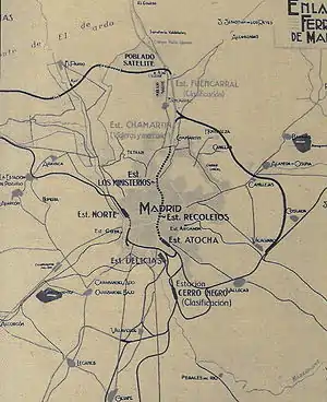 Durante la dictadura de Primo de Rivera continuaron las propuestas de alternativa para la conexión entre Príncipe Pío y Atocha. En 1924 Luis Montesino, marqués de Morella, senador del Reino e ingeniero, planteó una alternativa similar a las de Reyes pero que discurría por la calle Mayor, con estación central en la Puerta del Sol.[61][63] En 1926, el Plan preferente de Ferrocarriles de urgente construcción (más conocido como Plan Guadalhorce) incluía en la lista de ferrocarriles por construir uno de «circunvalación de Madrid», sin detallar trazado.[64] En 1928, una nueva propuesta, patrocinada por el duque de Vistahermosa, y elaborada por ingenieros de MZA, cambiaba el enfoque de las propuestas anteriores. En lugar de centrarse en un enlace subterráneo por el centro de Madrid, apostaba por una línea de circunvalación en superficie en las afueras de la ciudad. Esta línea rodeaba completamente Madrid y enlazaba con las líneas que llegaban a Madrid (incluyendo la proyectada línea directa entre Madrid y Burgos). De esta forma se garantizaba el tránsito de mercancías por Madrid y se esbozaba un servicio de trenes de viajeros suburbanos. Proyectaba también una gran estación de tránsito en la zona del Hipódromo y su enlace con Atocha mediante una línea secundaria subterránea.[61][65][66] Ese mismo año, con el patrocinio de la Compañía del Norte, uno de sus ingenieros, Luis Grasset, presentaba una nueva propuesta, que resultaba ser una contrapropuesta de su compañía a la de los ingenieros de MZA.[67] En ella se hacía finalizar el ferrocarril directo Madrid-Burgos en Príncipe Pío.[65] Ninguna de las dos fue puesta en práctica.[67]