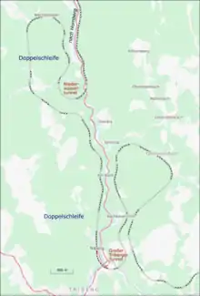 Mapa del tramo más difícil entre Hornberg y Triberg, donde la diferencia de altura se supera con dos bucles dobles.
