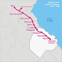 La línea tenía su estación terminal en la Aduana Nueva, situada en la intersección de las calles Paseo Colón y Victoria (actualmente Hipólito Yrigoyen) en el centro de Buenos Aires, y alcanzó el pueblo de Belgrano el 7 de diciembre de 1862, San Isidro el 10 de octubre de 1863 y San Fernando el 4 de febrero de 1864. La línea fue extendida hasta Tigre y al muelle de San Fernando en el año siguiente.