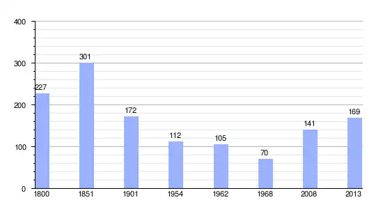 Los datos demográficos contemplados en este gráfico de la comuna de Feuguerolles-sur-Seulles,[4] se han cogido de 1800 a 1968 de la página francesa EHESS/Cassini, y los demás datos de la página del INSEE.[5]