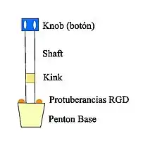 La fibra adenoviral es un homotrímero formado por una triple beta-espiral.[6] Esta se proyecta desde la base pentona hacia el exterior, adopta la forma de una larga barra denominada shaft y termina en una estructura globular llamada knob,[7] cuya traducción al español es botón o pomo. Se denomina kink a una parte del shaft que actúa de bisagra en el momento en que el virus tiene que adherirse a la superficie celular.[8]