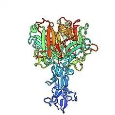 La fibra adenoviral se encuentra en los adenovirus, virus no encapsulados con cápside proteica icosaédrica y ADN bicatenario de entre 34 y 38 kilobases. [4]Estos virus tienen 13 proteínas estructurales, una de las cuales es la proteína IV. Estas fibras adenovirales (en cada virión hay en total 12) se proyectan hacia el exterior desde la cápside del virus, a la cual se unen gracias a su asociación con otras proteínas llamadas bases pentonas (proteína III).[5]