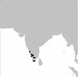 Se localiza en los Ghats Occidentales centrales y meridionales, los montes Nilguiri y Palni, en el sur de la India. La población principal de esta especie se encuentra en mesetas por encima de los 1.500 msnm de los montes Nilgiri, Palani, Biligiriranga (Bellaji y Honnametti) y montes Kannan Devan. Prefiere zonas con mucha hojarasca y sotobosque en hábitats herbáceos entre los bosques abiertos de tipo shola. Su densidad de población es de unas 2,8 ha por pareja en la época de cría. Es un pájaro muy sedentario, y no se registran desplazamientos locales o dispersión de los jóvenes.[4] En su extremo norte, se encuentre en el parque nacional de Kudremukh National Park y los montes Bababudan y alcanza los montes Ashambu por el sur.[5] Existen algunos registros antiguos de la especie en Maharashtra y Sri Lanka que se consideran dudosos.[6][7][4]