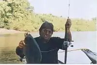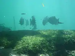 ![]() Ejemplares de pacú en su ambiente silvestre; sobre esta especie se desarrolla un torneo de pesca deportiva. | ||