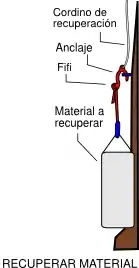 En grandes paredes la fifi es muy útil para recuperar material (siempre empaquetado en mochila o petate) entre reuniones. Imaginemos un petate colgado de un anclaje de la pared a través de la fifi. En este caso, el orificio de recuperación de la fifi está atada al escalador con un cordino igual o superior a la longitud del largo a escalar. Llegado a la reunión el escalador tirará del cordino liberando al petate del anclaje y dejándolo listo para ser izado. Normalmente es recomedable una polea para el trabajo de izado.