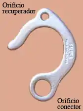 Uso de los orificios: Orificio conector al estribo con maillón o mosquetón. Orificio recuperador a un cordino tan largo como requiera la maniobra (entre 1 y 2 m)