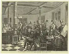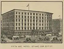 La campaña del presidente Ulysses S. Grant comenzó en una cena en el hotel, y él y su gabinete una vez celebraron allí una sesión oficial.[14] El abogado Chester A. Arthur (quien luego se convirtió en presidente de los Estados Unidos) mantuvo una suite para su oficina;[15] Eduardo VII se hospedó aquí en su gira por América del Norte, al igual que su cuñado, Pedro II y Agustín de Iturbide y Green, hijo adoptivo de Maximiliano.[16] "Era un lugar de reunión para peces gordos como Boss Tweed, Jay Gould, Jim Fisk y Commodore Vanderbilt, que intercambiaban acciones aquí fuera de horario".[17] El de la ciudad de Nueva York, John Franklin Gray, vivía en el hotel. Cuando el joven Jim Fisk, sumamente seguro de sí mismo, llegó por primera vez a Nueva York, se alojó en el hotel de la Quinta Avenida hasta que se arruinó temporalmente.[18] Gore Vidal hizo del hotel Fifth Avenue un escenario en su novela 1876, porque fue en una de sus suites donde John C. Reid, editor de The New York Times, despertó al presidente del Comité Nacional Republicano, Zachariah Chandler, y preparó la campaña para la controvertida elección presidencial de 1876.