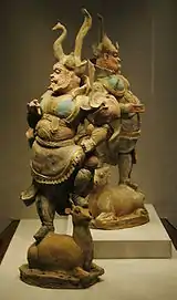 El lokapala también se encontró en el suelo en templos budistas, en piedra o madera.[63] Parecen representar una fusión de los guardianes taoístas tradicionales, que se remontan a la dinastía Han, y el dvarapala budista o «Reyes celestiales», de los cuales había en teoría cuatro, aunque a menudo únicamente dos fueron representados en otras culturas budistas. También se mostraron como «un semihumano de cresta fabulosa con ojos saltones, boca furiosamente abierta y brazos y piernas poderosos».[30] Mientras que las versiones indias enfatizaban los atributos reales, en China fueron «transformados en dinámicos generales idealizados»,[63] con una armadura elaborada, a menudo con relieves añadidos.