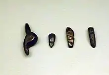 Entre las obras de arte plásticas halladas en la cueva destacan un escarabajo y dieciséis figurinas femeninas, estatuillas de Venus, quince de azabache (madera negra fósil) y una de cornamenta de reno.[3] El azabache es más fácil de tallar que el marfil o la cornamenta.[3] Se trata de objetos pequeños representados de perfil y altamente estilizados. Solo en una de las estatuillas se puede reconocer cuello, pecho y cintura.[4] En el resto de las figuras un cono —en la mayoría de los casos perforado— se encuentra en el lugar de la cabeza y parte superior del cuerpo. Por tanto se supone que estas piezas fueron utilizadas como colgantes o adornos de vestidos. El cuerpo es representado como una silueta con las posaderas muy pronunciadas.[4] La entalladura distinta en la región inguinal equivale a la inclinación en el dorso de las piernas. De esta manera en una vista frontal dan la impresión de personas sentadas. De perfil las piernas están ligeramente flexionadas y parecen ser una repetición de la parte superior coniforme. Del desarrollo del estilo en el Paleolítico superior se concluye que las figurinas son representaciones del cuerpo femenino.[4]