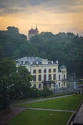 La Filarmónica Nacional es un edificio de ladrillo de dos plantas, obra del arquitecto kievita Vladimir Nikolayev,[4] cuyos rasgos más distintivos son las dos torres de media altura a ambos lados de la fachada y sus aleros recubiertos de metal.[5]