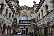 La entrada principal constituye una logia, a saber, una galería cubierta por un techo pintado con los doce signos del zodíaco, y abierta a ambos lados.[5][6] El interior de la sala principal está recubierto de paneles pintados en color cedro oscuro —obra de Nikolai Karazin—, retratando el desarrollo del comercio a lo largo de la historia de la ciudad,[8][9] y las ventanas están elaboradas en mármol de Carrara, con su color blanco particular.[10]