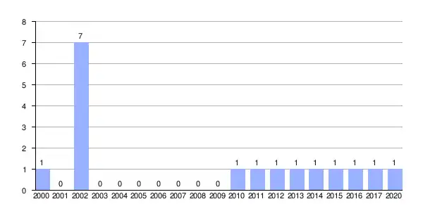 Gráfica de evolución demográfica de Filgueira entre 2000 y 2020 |