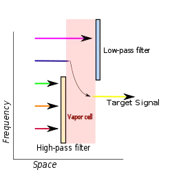 El siguiente elemento es la celda de vapor, componente esencial de todos los filtros atómicos de línea. Según el tipo de filtro, la celda de vapor absorbe y como reemite la luz incidente, o cambia su polarización por el efecto Faraday o Voigt. A continuación de la celda de vapor se encuentra el filtro paso bajo para bloquear toda la luz excepto la de la frecuencia emitida por el vapor o, en los filtros de Faraday y Voigt, la segunda placa de polarización.