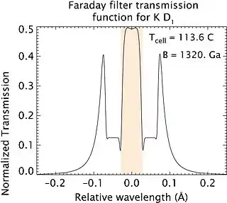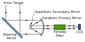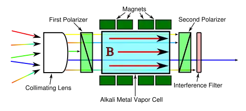 El filtro de Faraday, conocido como filtro magneto-óptico, FADOF o EFADOF (Excited Faraday Dispersive Optical Filter) se basa en la rotación del plano de polarización de la luz que atraviesa la celda de vapor por el efecto Faraday. La luz con frecuencias cercanas de las líneas de absorción atómicas del vapor atraviesa el filtro con intensidad cercana a la de la señal original pero con una polarización diferente, mientras que el resto de la radiación electromagnética se bloquea mediante filtros de polarización.[16] Este efecto está relacionado con el efecto Zeeman,[17] el desdoblamiento de las líneas de absorción atómica en presencia de un campo magnético.[18][19]