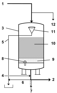 El esquema ilustra la estructura general de un filtro de arena de presión rápido. La arena del filtro ocupa la mayor parte del espacio de la cámara. Se asienta sobre un suelo de boquillas o sobre un sistema de drenaje que permite la salida del agua filtrada. El agua bruta pretratada entra en la cámara de filtrado por la parte superior, fluye a través del medio filtrante y el efluente se drena a través del sistema de drenaje en la parte inferior. Las grandes plantas de proceso tienen también un sistema implementado para distribuir uniformemente el agua bruta al filtro. Además, suele incluirse un sistema de distribución que controla el flujo de aire. Este sistema permite una distribución constante del aire y del agua y evita caudales de agua demasiado elevados en zonas específicas. Una distribución típica de los granos sale debido al retrolavado frecuente. Los granos de menor diámetro predominan en la parte superior de la capa de arena, mientras que los granos gruesos dominan en las partes inferiores.