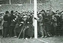 A los once minutos de comenzado el partido, la multitud nuevamente sobrepasó las líneas de demarcación de la cancha, llevando a la suspensión del encuentro mientras la policía montada despejaba el campo de juego. Un número de fanes requirieron primeros auxilios por parte de miembros de la Cruz Roja Británica mientras los futbolistas aguardaban la reanudación del encuentro. De ahí en adelante, la policía se mantuvo patrullando el perímetro del campo para dejarlo libre de personas que pudieran interferir en la acción de los árbitros asistentes.[17]
