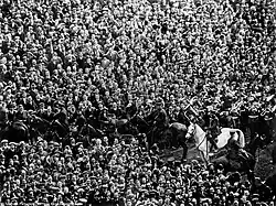 Antes del comienzo del encuentro una gran multitud se abalanzó al interior del estadio, excediendo ampliamente su capacidad oficial de aproximadamente 125 000 espectadores. Una multitud estimada en casi 300 000 personas consiguieron su entrada, lo que provocó que se abarrotaran las gradas del estadio, llevando a que los espectadores que no encontraron sitio lo encontraran en el terreno de juego. La policía montada, incluyendo a un efectivo montado en un caballo blanco que se convirtió en la postal del encuentro, se vio obligada a actuar para despejar el terreno de juego, posibilitando así el comienzo del encuentro.[4]