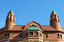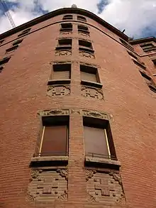 Muestra de lenguaje expresionista es este edificio. De raíz holandesa, concretamente de la "escuela de Ámsterdam", la utilización del ladrillo rojo visto, cuidadosamente aparejado, introduce variaciones en los elementos ornamentales, que no son de piedra, sino que se sustituyen por elementos cerámicos, que en unos casos son vidriados y de color verde y en otros del mismo aspecto que el ladrillo. La piedra es utilizada con mesura únicamente en los remates de los torreones y en los vierteaguas de las ventanas.