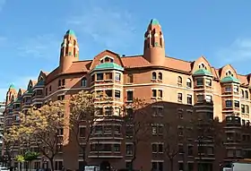 En la parte superior, la fachada exterior se eleva por encima de la cornisa, siguiendo el mismo ritmo que los miradores, en lo que corresponde a una planta abuhardillada destinada a trasteros y a la vivienda del portero. En cada chaflán se levanta una pareja de torreones, ideados como depósitos de agua, aunque nunca llegaron a cumplir esa función. Las ventanas son de forma rectangular, a excepción de las de la última planta, que adquieren forma de arco de medio punto, apariencia que también toman los huecos de los portales. Las fachadas incluyen algunas piezas prefabricadas de hormigón armado o de piedra artificial, decoradas en los dinteles y lisas en los vierteaguas. Otros elementos ornamentales están realizados en terracota.