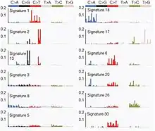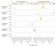 Estas 6 firmas están divididas en siete (A-G) subgrupos que muestran asociaciones distintas con otras características genómicas, histológicas o de expresión génica.[1]