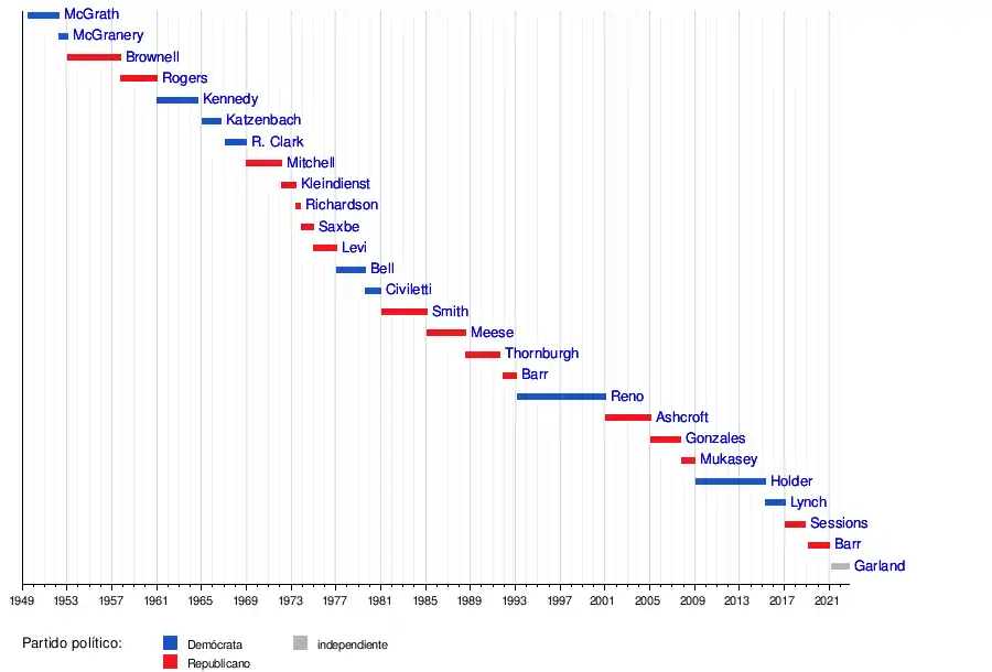 Merrick GarlandWilliam BarrJeff SessionsLoretta LynchEric HolderMichael MukaseyAlberto R. GonzalesJohn AshcroftJanet RenoWilliam BarrElliot L. RichardsonJohn MitchellRamsey ClarkRobert F. KennedyWilliam P. Rogers