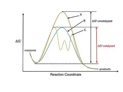 El estudio de la catálisis y las reacciones catalíticas es muy importante para el campo de la fisicoquímica orgánica. Un catalizador participa en la reacción química pero no se consume en el proceso.[14] El catalizador baja la barrera de la energía de activación (), aumentando la velocidad de reacción, ya sea estabilizando la estructura del estado de transición o desestabilizando una reacción intermedia clave. Puesto que sólo se necesita una pequeña cantidad de catalizador, este mismo puede dar acceso fácil a moléculas orgánicas que de otra forma serían caras y difíciles de sintetizar. Los catalizadores también pueden influir en las velocidades de reacción cambiando el mecanismo de reacción.[3]