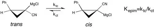 Un ejemplo moderno del estudio de los efectos de los disolventes en el equilibrio químico puede verse en el estudi de Carlier et al. acerca de la epimerización de reactivos de Grignard de ciclopropilnitrilo quiral.[17] En este estudio se muestra que la constante de equilibrio para la isomerización de cis a trans del reactivo de Grignard es mucho mayor (es decir, la preferencia para la forma cis se incrementa) en tetrahidrofurano (THF) sobre éter dietílico. Sin embargo, una velocidad más rápida de isomerización de cis a trans en THF da como resultado una pérdida de pureza estereoquímica. Entender la configuración molecular de reactivos como estos es particularmente importante para mejorar la selectividad en síntesis asimétricas.