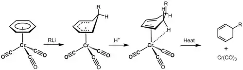 - Semmelhack, M. F.; Hall, H. T.; Yoshifuji, M. (1976). «.eta.5-Cyclohexadienyltricarbonylchromium(0) intermediates in the reaction of carbanions with .eta.6-arenetricarbonylchromium(0)». Journal of the American Chemical Society 98 (20): 6387-6389. doi:10.1021/ja00436a056.