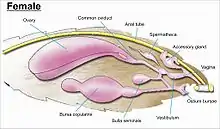 La función del sistema reproductor femenino es producir huevos, incluyendo la cubierta protectora, y almacenar espermatozoides hasta el momento apropiado para la fertilización. Los órganos reproductivos de la hembra incluyen un par de ovarios ubicados en una cavidad llamada cámara genital. Vuelcan sus huevos (ovocitos) en un par de oviductos laterales que, a su vez, se unen en un oviducto central. La abertura o gonoporo del oviducto común está oculta dentro de la cámara genital que sirve como bolsa copulatriz (bursa copulatrix) durante el apareamiento. La abertura externa se llama vulva. En muchas especies la vulva es angosta y la cámara genital es una bolsa o tubo llamado vagina. Una estructura en forma de saco, la espermateca, está relacionada con la vagina. Los espermatozoides son almacenados en este órgano hasta que se los requiere para la fertilización. Una glándula secretora nutre a los espermatozoides almacenados.[6][13]