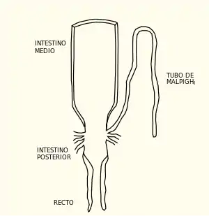 El sistema digestivo de los insectos consiste de un largo tubo que recorre el cuerpo de un extremo a otro. Permite la entrada de alimentos por la boca, procesa ese alimento y elimina los restos por el ano. El tubo digestivo tiene secciones específicas para triturar, almacenar y absorber el alimento. Hay secciones que segregan enzimas que modifican las moléculas y que ayudan a la absorción de nutrientes. Hay esfínteres que regulan el paso del alimento y los líquidos de una región a otra.[1][6]