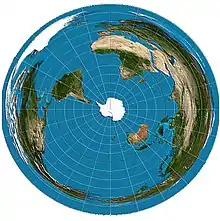 El modelo de mapa usado por la Sociedad de la Tierra plana en su logotipo para representar el mundo plano es una proyección de la ciencia de la Cartografía llamada acimutal equidistante, una proyección circular plana que estira progresivamente distancias y tierras hacia el borde. Al ser círculo plano tiene su centro pero no tiene polos, de modo que no es que está centrada en un polo sino en el Ártico. La consecuencia es que el Antártico abarca todo el borde y de ahí la idea que la Tierra está rodeada por una muralla de hielo. Sin embargo también existe la proyección centrada en el Antártico en la que el borde está abarcado por el océano Glacial Ártico, y también se aprecia más la distorsión porque la mitad del mundo desde el ecuador hasta el Ártico alberga la mayor parte de las tierras (Europa, Asia, Norteamérica y Groenlandia). Por otro lado la humanidad que vive en el mundo austral (hemisferio sur) ve otro polo celeste y otra estrella polar diferentes a los que se ven desde el mundo septentrional (hemisferio norte) aunque ambos polos celestes se aprecian desde el ecuador.