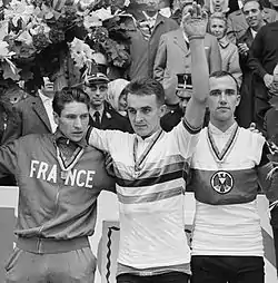 ![]() Francis Bazire, Flaviano Vicentini (en el centro) y Winfried Bölke en el podio del Mundial de 1963. | ||||||||||||||||