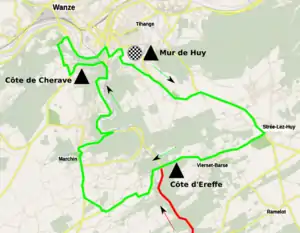 El recorrido tuvo algunos cambios con relación a la edición anterior, como importante novedad la línea de salida regresa a la ciudad de Ans situado en la Región Valona de Bélgica, desde allí el pelotón puso rumbo hacia las cimas de la Côte de Tancrémont y la Côte des Forges para, acto seguido, abandonar las carreteras de la provincia de Lieja en Bélgica e ingresar a carreteras del país de Luxemburgo por unos cuantos kilómetros. Más adelante, de nuevo en Bélgica, los continuos toboganes seguirán minando la moral y las fuerzas de los corredores hasta llegar al primer paso por el tríptico de la Côte d’Ereffe, Côte de Cherave, y el Muro de Huy, y afrontar las tres vueltas al circuito final de 29 kilómetros y finalizar en el tradicional Muro de Huy.[1][2]