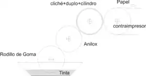 Las impresoras suelen ser rotativas, y la principal diferencia entre estas y los demás sistemas de impresión es el modo en que el cliché recibe la tinta. Generalmente, un rodillo giratorio de caucho u otros materiales, como el poliuretano o uretano, recoge la tinta y la transfiere por contacto a otro cilindro, llamado anilox. El anilox, por medio de unos alvéolos o huecos de tamaño microscópico, formados generalmente por abrasión de un rayo láser en un rodillo de acero y con cubierta de cromo o cerámica, transfiere una ligera capa de tinta regular y uniforme a la forma impresora, grabado o cliché. Posteriormente, el cliché transferirá la tinta al soporte a imprimir.[3]