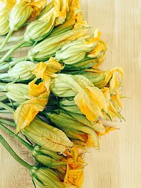 Las flores de calabaza son perecederas y, como tales, rara vez se almacenan en los supermercados.[2] Las flores de calabaza pueden ser masculinas o femeninas y se usan indistintamente; sin embargo, son las femeninas las que posteriormente se convierten en frutos,[2][3] por lo que se prefiere la cosecha de las flores masculinas (dejando algunas para la polinización).[3]