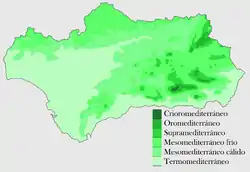El clima de Andalucía, de tipo mediterráneo con influencia oceánica, caracterizado por la escasez de precipitaciones en verano, la alta insolación y las escasez de heladas. En el ombroclima[6] húmedo (1000-1600 mm) y subhúmedo (600-1000 mm) se encuentran las zonas abiertas a los vientos húmedos del Atlántico o las zonas que por su altitud reciben un aporte mayor de agua. El ombroclima seco (350-600 mm) se desarrolló en la mayoría del territorio al que está ligado el encinar como vegetación climácica. Por último, el ombroclima semiárido (<350 mm) se desarrolla en las zonas de Granada y Almería, donde Sierra Nevada y las Alpujarras impiden la penetración de los vientos húmedos del Atlántico.