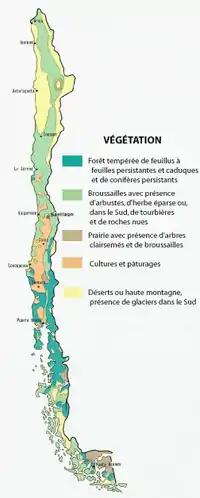 Actualmente, alrededor de los 30°S, los ecosistemas de bosques mediterráneos-subtropicales de Chile central y templado-húmedos del sur del país son reemplazados por semi-desiertos y desiertos hiperáridos que se extienden hasta cerca del Ecuador. En contraste, en la región de Clima mediterráneo de Chile central, situada entre 30° y 38°S, las formaciones dominantes son el bosque caducifolio Maulino de Nothofagus, el bosque subtropical esclerófilo, y el matorral de espino maulino. En la región de Clima templado, al sur de 38°S, el aumento de la precipitación, con lluvias de invierno y verano, determina la presencia de bosques siempreverdes de los tipos Valdiviano, Nordpatagónico y Subantártico.[2]