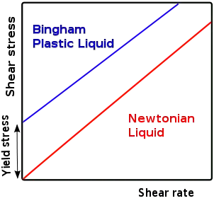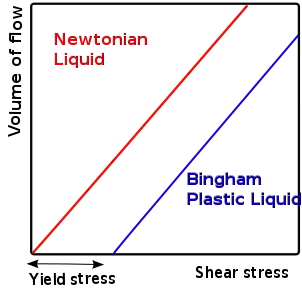 La Figura 1 muestra un gráfico del comportamiento de un fluido viscoso (o newtoniano) ordinario en rojo, por ejemplo, en una tubería. Si se aumenta la presión en un extremo de una tubería, se produce una tensión en el fluido que tiende a hacer que se mueva (denominada tensión de corte) y el caudal volumétrico aumenta proporcionalmente. Sin embargo, para un fluido de Bingham (en azul), se puede aplicar tensión, pero no fluirá hasta que se alcance un cierto valor, la tensión de fluencia. Más allá de este punto, la tasa de flujo aumenta de manera constante al aumentar el esfuerzo cortante. Esta es aproximadamente la forma en que Bingham presentó su observación, en un estudio experimental de pinturas.[3] Estas propiedades le permiten al fluido de Bingham tener una superficie texturada con crestas y picos en vez de presentar una superficie lisa como la de un fluido newtoniano.