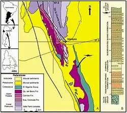 El límite inferior está definido por conglomerados polimícticos que se apoyan mediante una discordancia erosiva sobre pelitas y evaporitas de la Formación Quebrada del Barro y el límite superior corresponde a depósitos de areniscas finas con láminas de evaporitas que están cubiertas por las sedimentitas cretácicas de la cuenca El Gigante a través de una discordancia angular erosiva.[1]